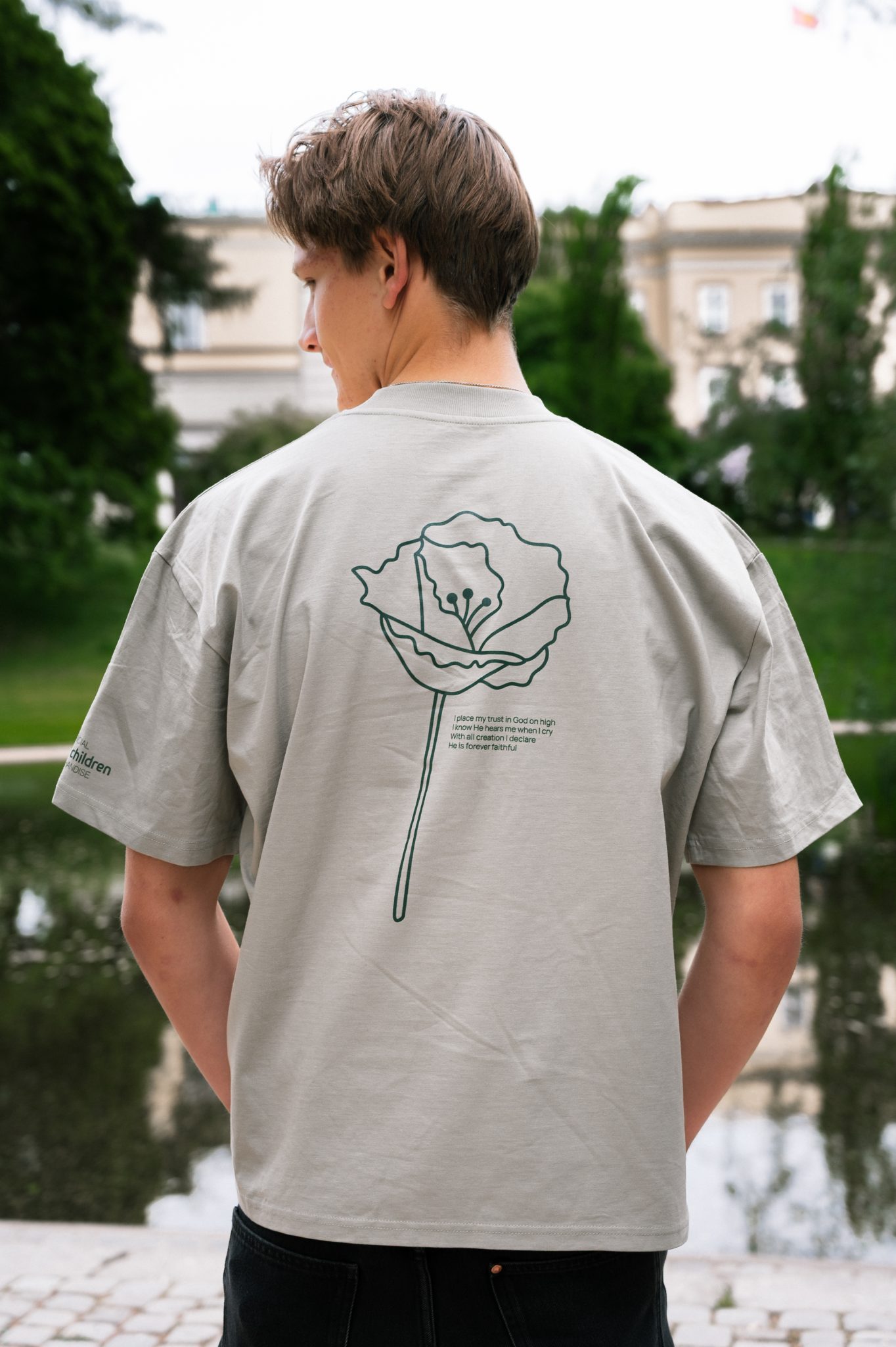 På ryggen er det trykk i grønt; en valmue og teksten til sangen “Faithful” står ved siden av.