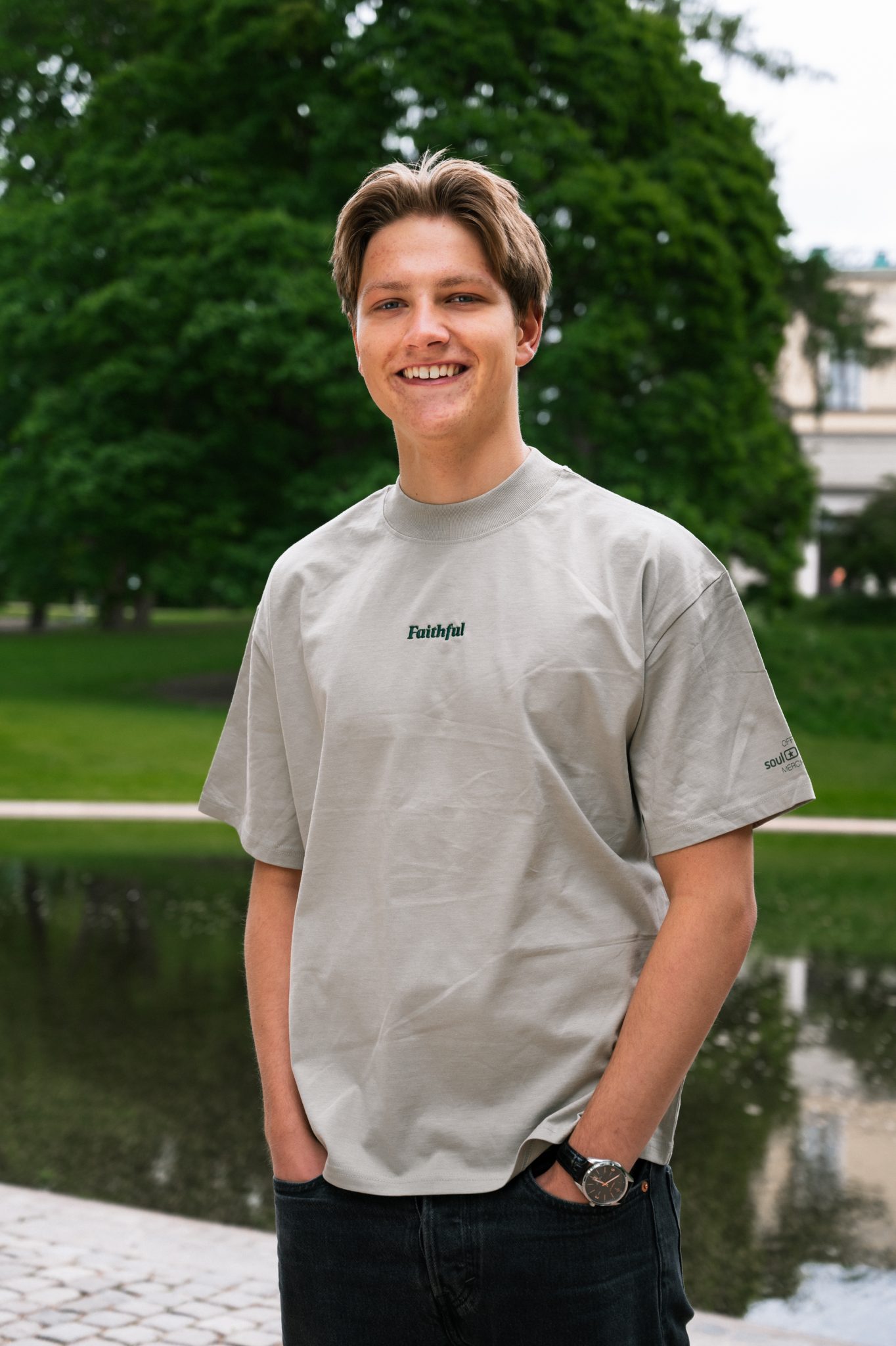 T-skjorte i fargen “stone” med Faithful i grønt på brystet.